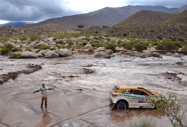 Pembalap Brasil, Youssef Haddad, terjebak di sungai lumpur di antara Salta dan Tucuman, Argentina. Haddad mencoba melewati sungai namun mobil Mitsubishinya malah terjebak.